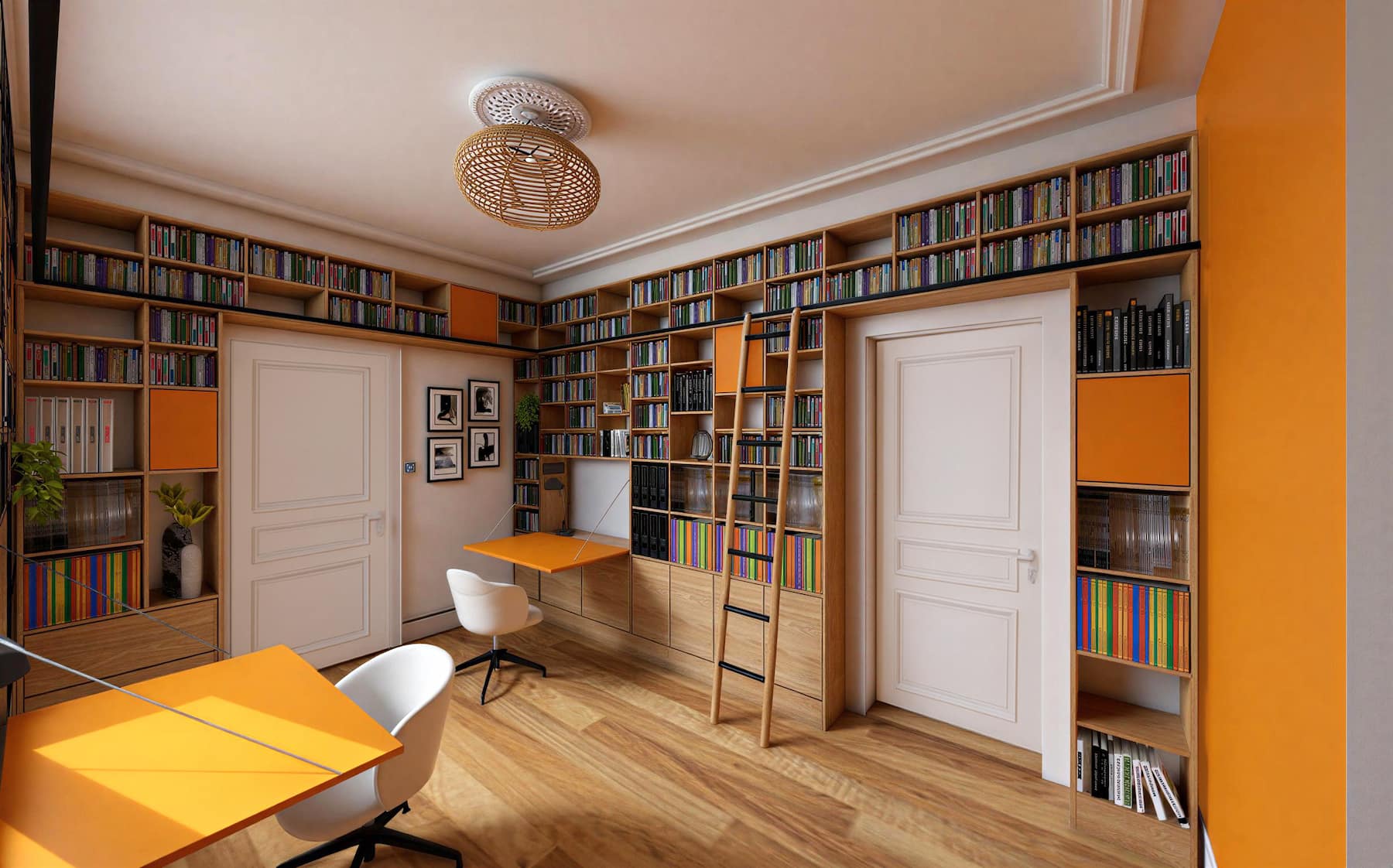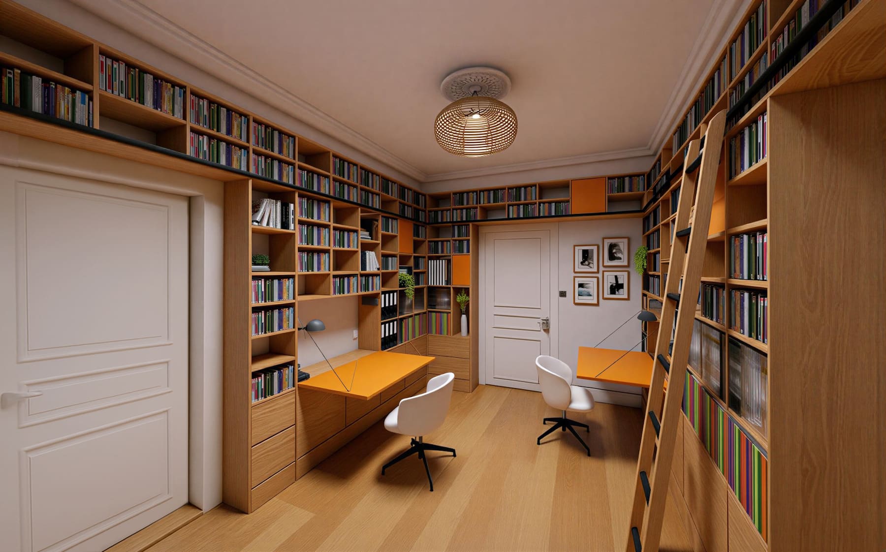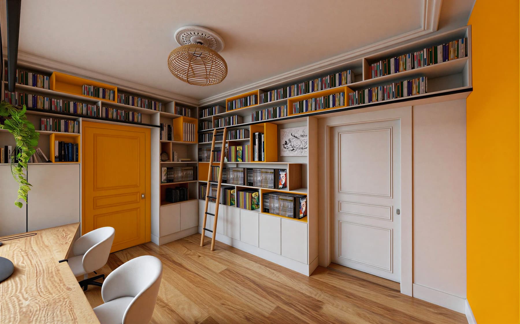 Nous avons proposé une bibliothèque sur mesure mêlant niches ouvertes pour les livres, rangements fermés pour l’archivage et bureaux intégrés. Une échelle coulissante donne accès aux niveaux hauts.