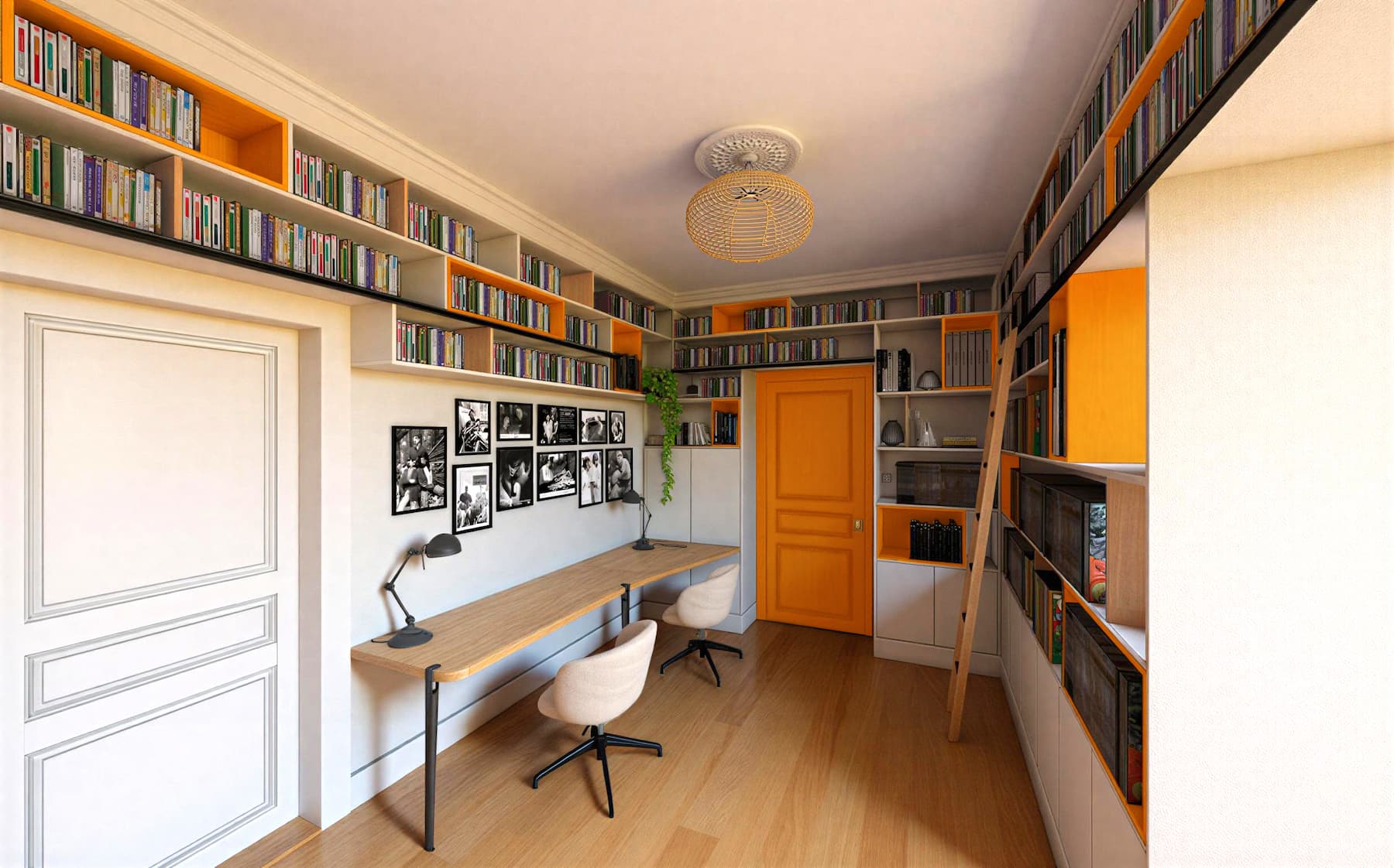 Nous avons été sollicités pour concevoir l’aménagement sur-mesure d’une pièce destinée à devenir un bureau-bibliothèque pour travailler à deux, stocker une grande quantité d’ouvrages et garder une ambiance chaleureuse.