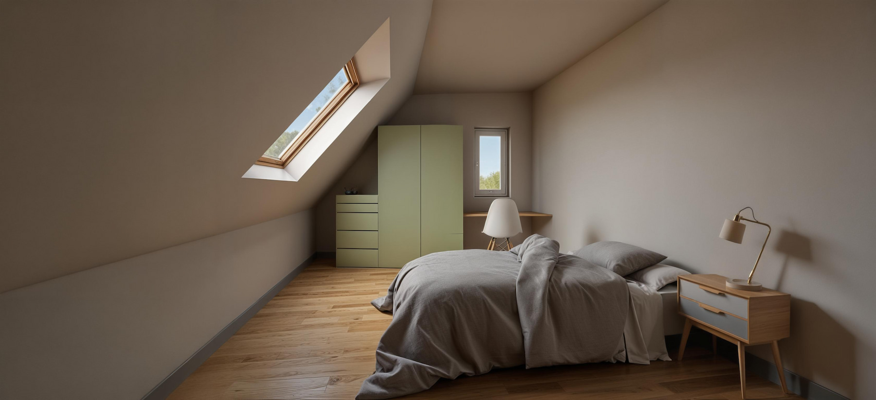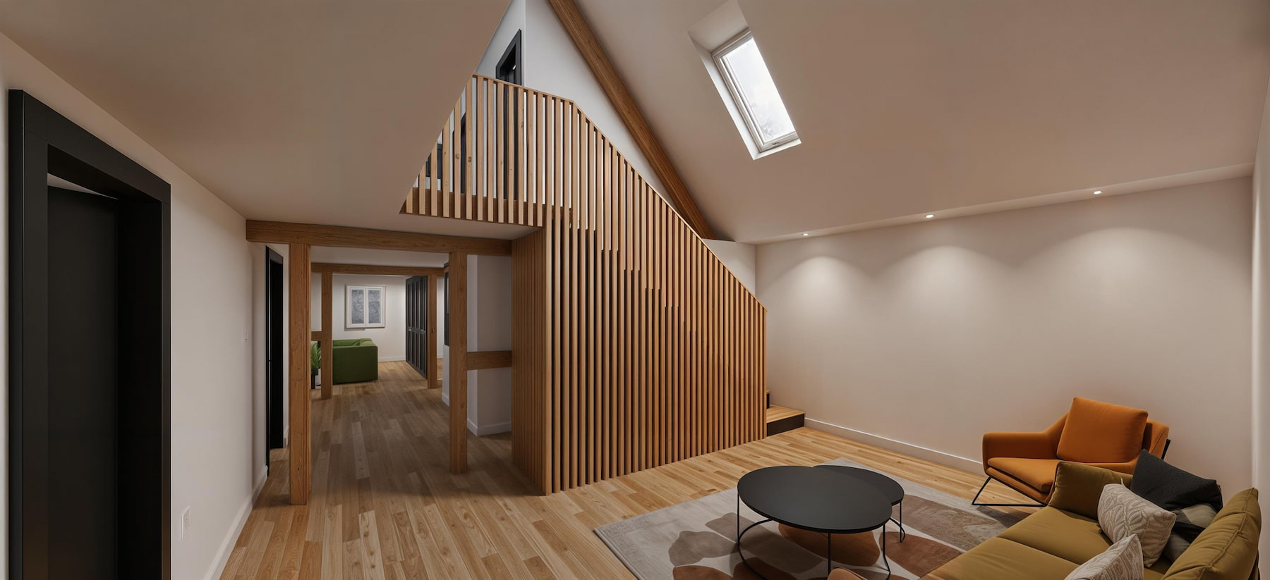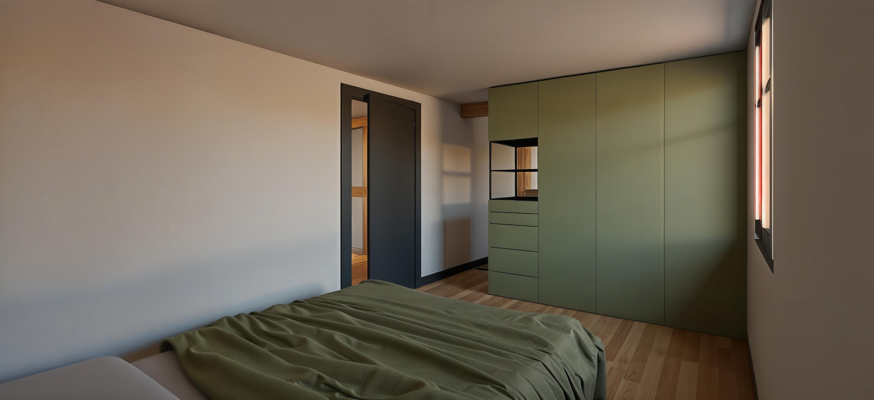 Les combles deviennent habitables : garde-corps à lames bois, lumière zénithale (velux) et circulations lisibles. Chambre parentale avec grands placards vert sauge et salle d’eau graphique (double vasque, douche à l’italienne, robinetteries noires). Chambre enfant sous rampant : bureau à la fenêtre et rangements intégrés.