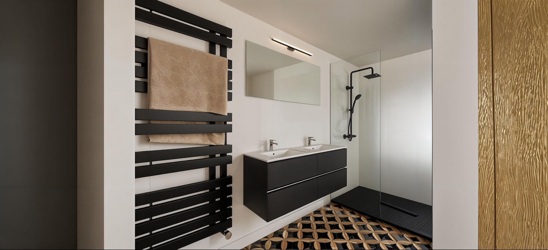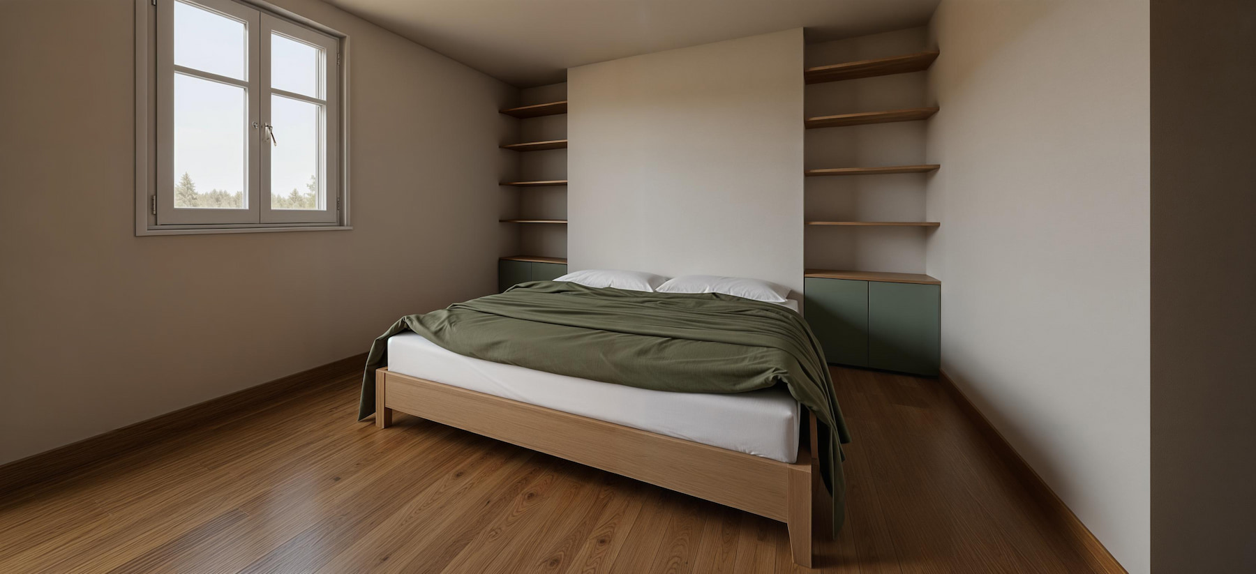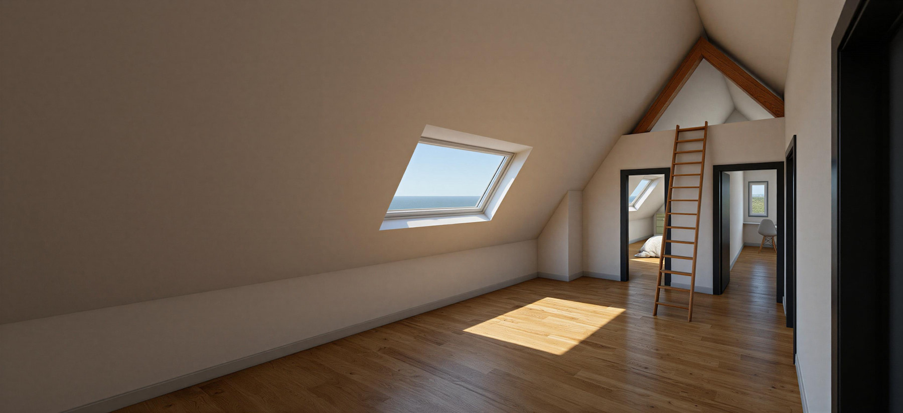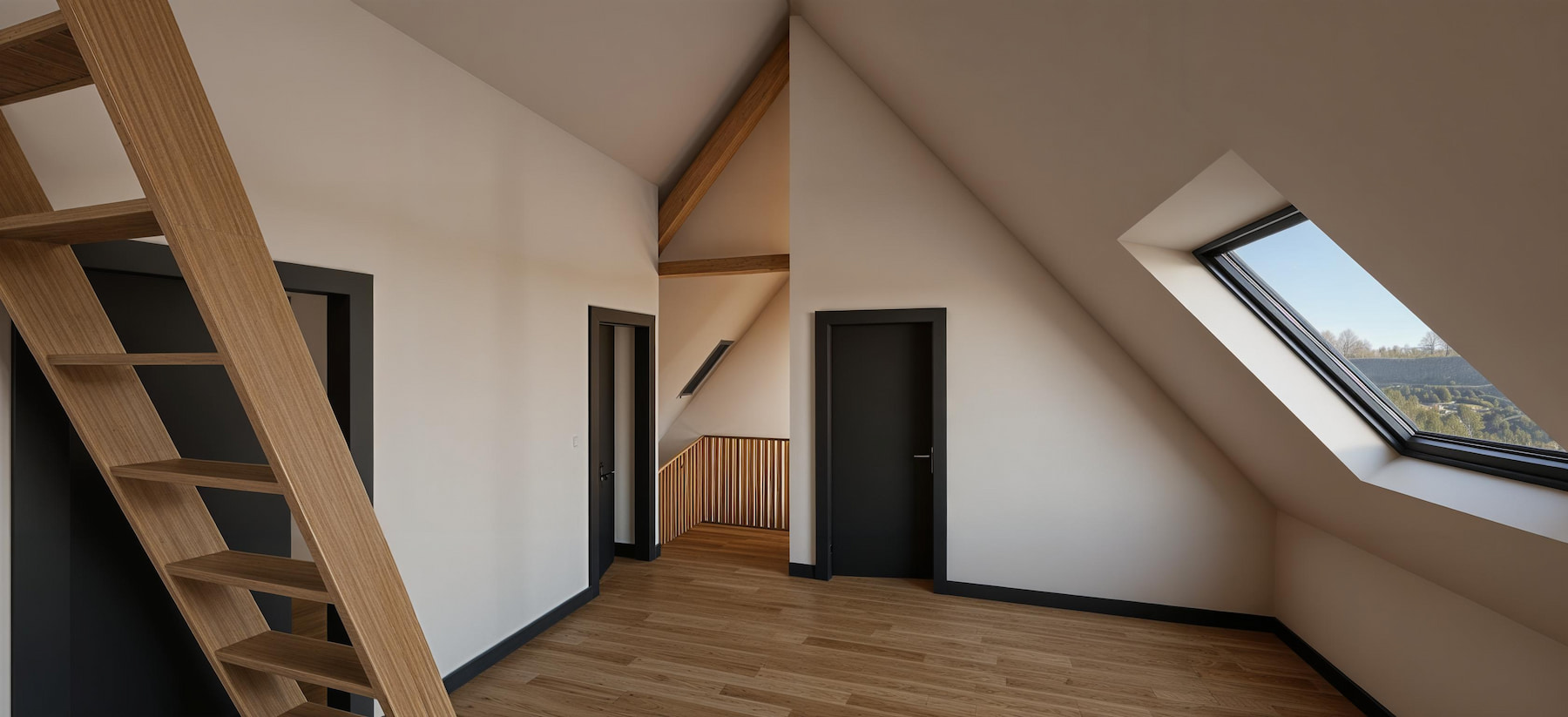 Les combles deviennent habitables : garde-corps à lames bois, lumière zénithale (velux) et circulations lisibles. Chambre parentale avec grands placards vert sauge et salle d’eau graphique (double vasque, douche à l’italienne, robinetteries noires). Chambre enfant sous rampant : bureau à la fenêtre et rangements intégrés.