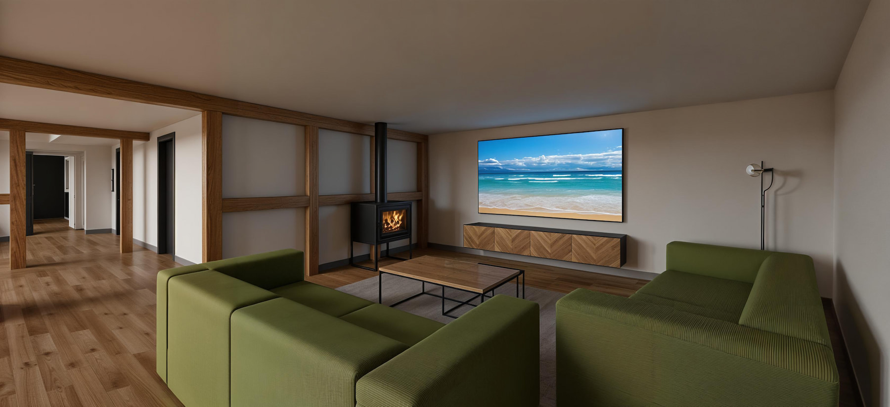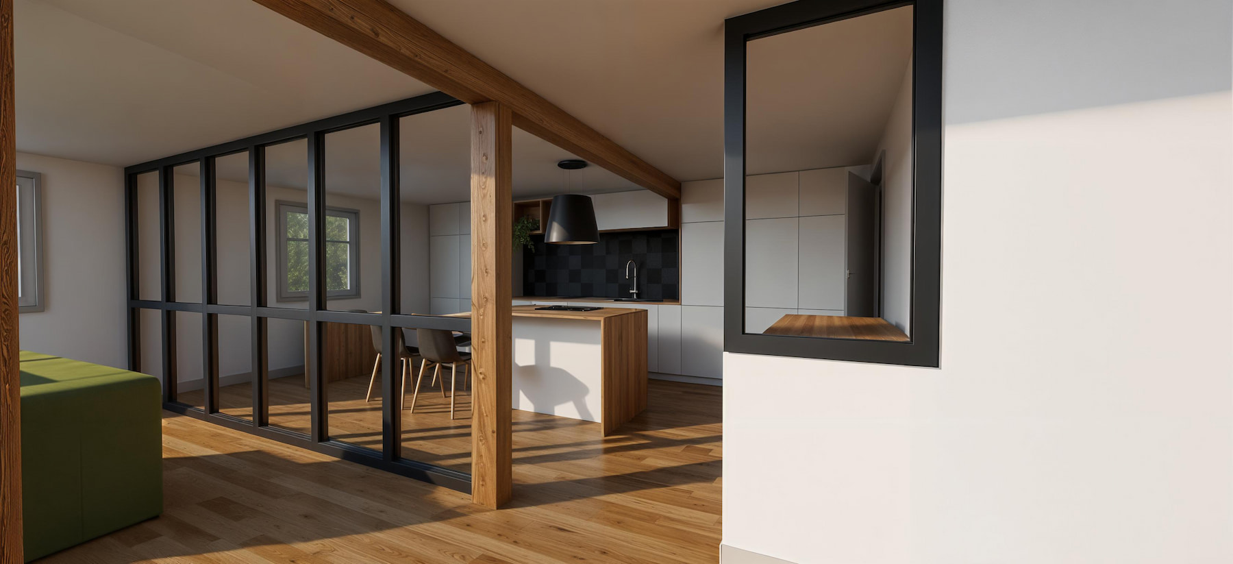 Nous redessinons la distribution jour/nuit et plaçons le séjour-cuisine au cœur. Le vocabulaire associe chêne, blanc, noir graphite et vert sauge pour unifier l’ensemble. Les poutres et colombages existants sont conservés et mis en valeur.
