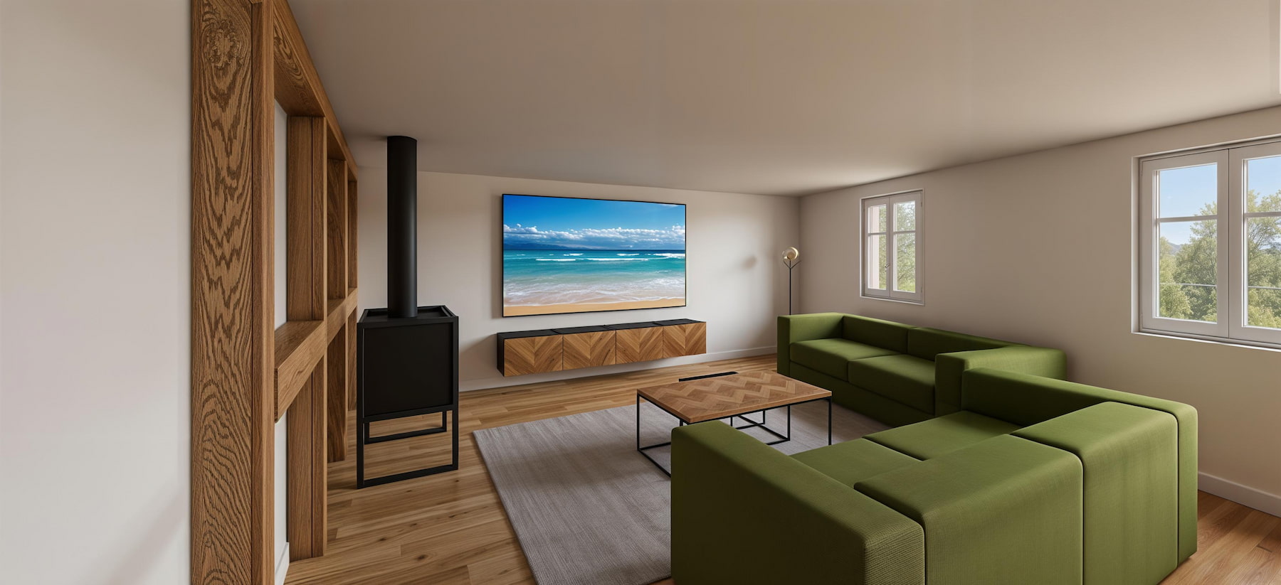 Cuisine blanche & chêne avec îlot-table convivial, crédence minérale et verrière/claustra pour structurer sans couper la lumière. Côté salon, un poêle et un mobilier modulable composent un espace chaleureux ; rangements bas et meuble TV suspendu allègent la perspective.