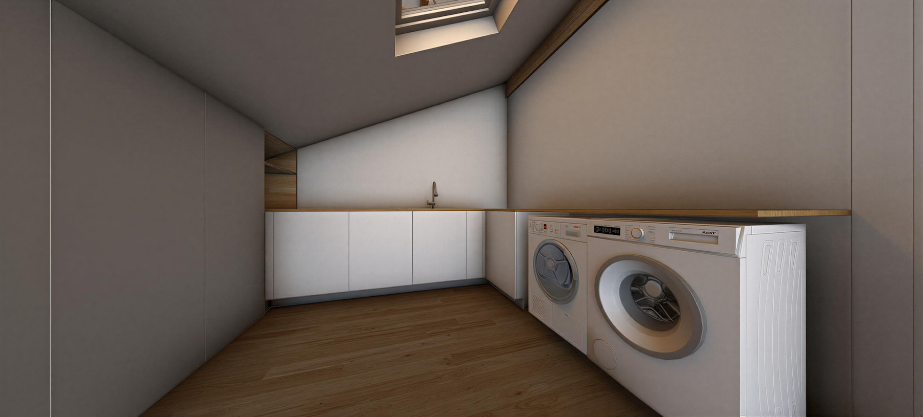 Buanderie sous combles : plan de travail continu, rangements pleine hauteur.