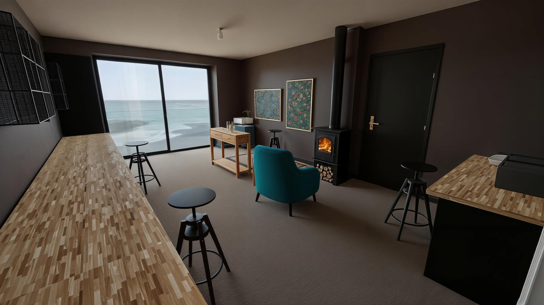 Atelier de peinture : longues banques de travail, poêle à bois, grande baie vitrée pour profiter de la lumière et des vues.