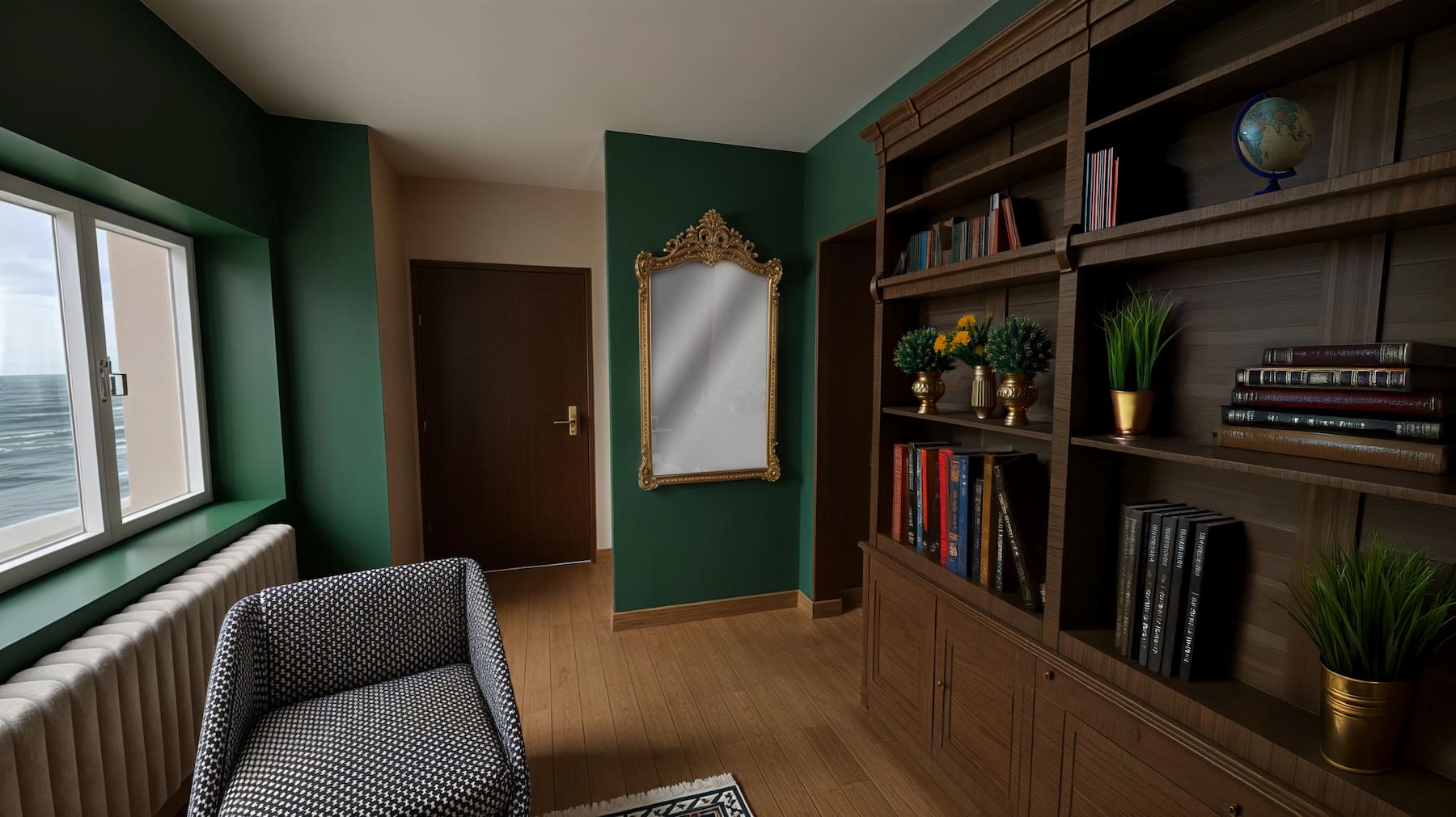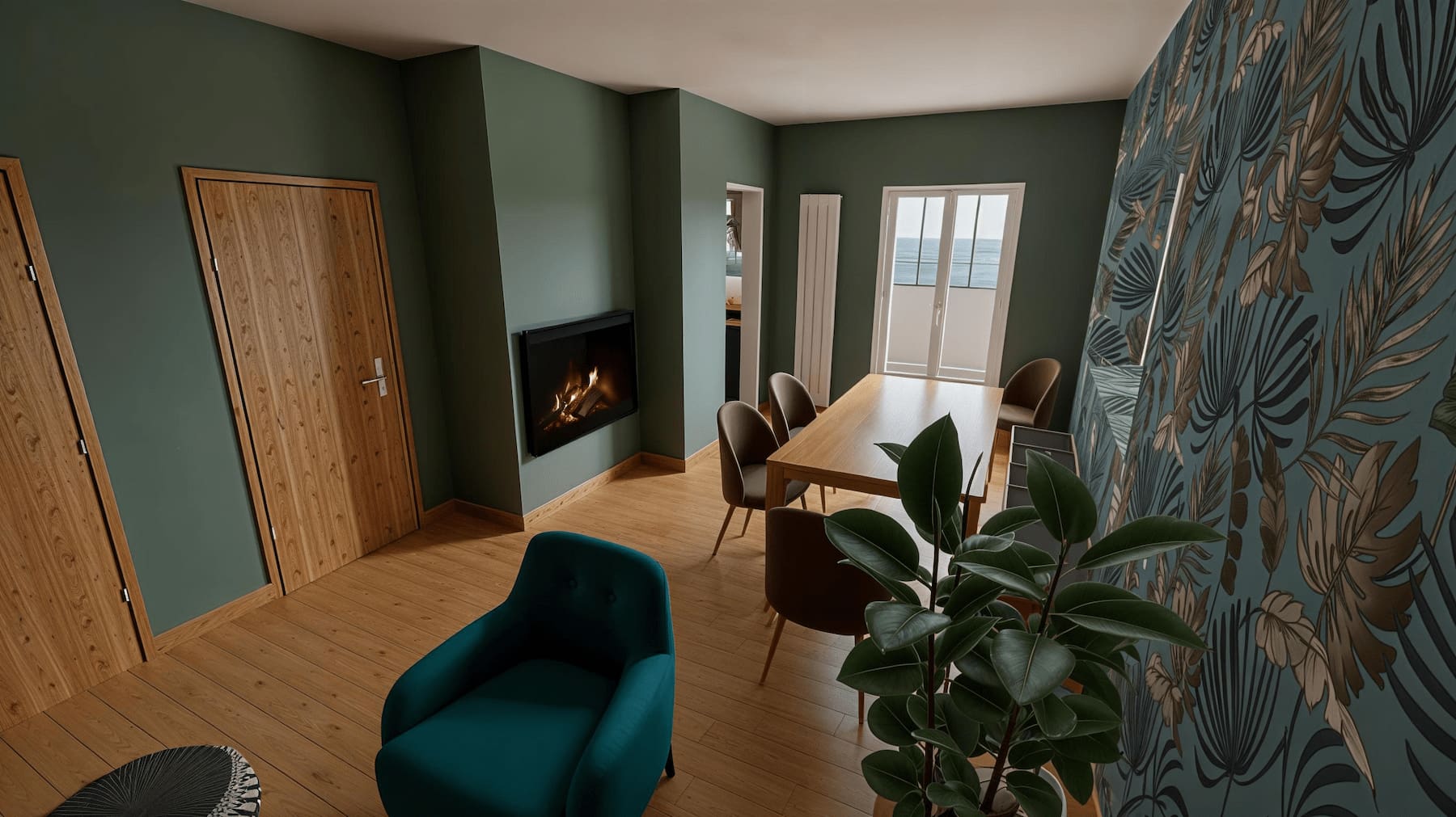 Palette verts/bleus + bois naturel pour relier les espaces.