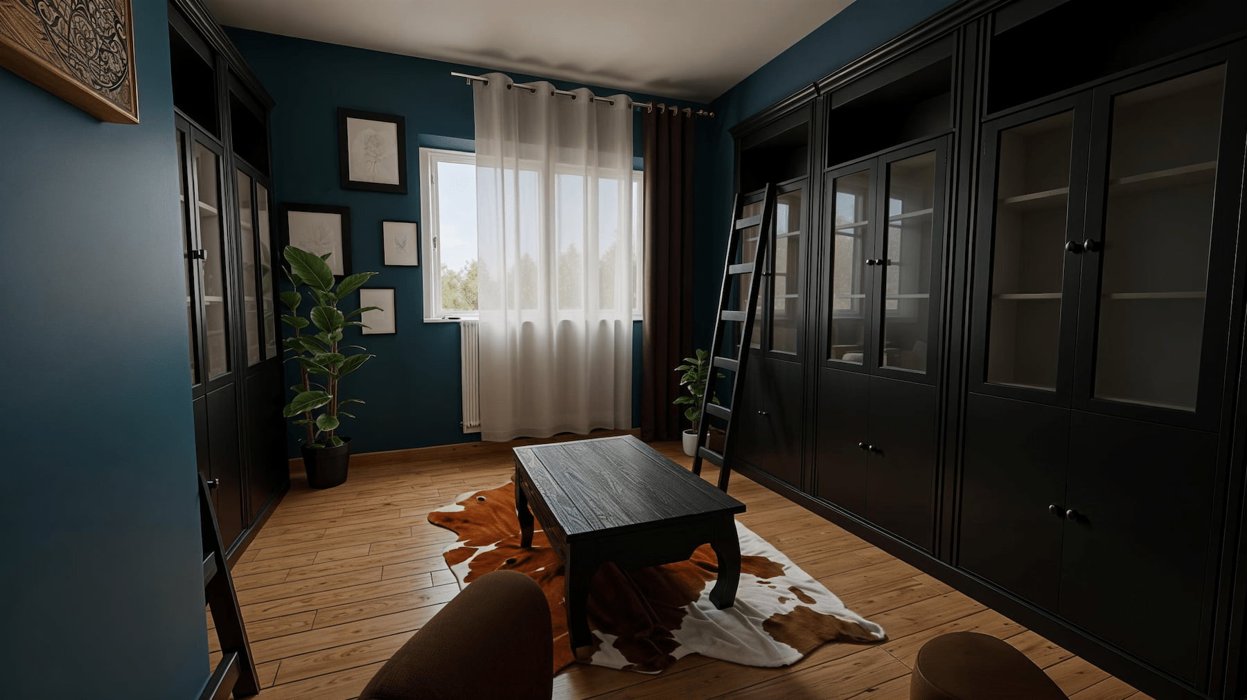 Entrée / bibliothèque : vitrines noires, échelle, rangement optimisé pour livres et objets.