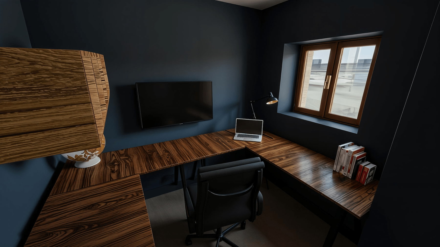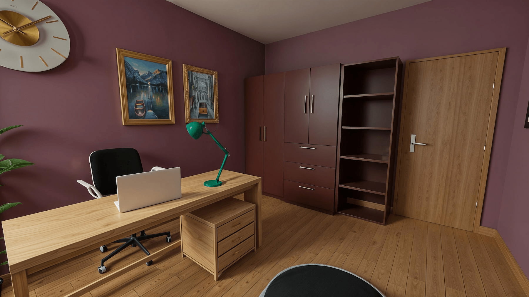 Bureau : espace dédié au télétravail, plateau bois, éclairage de tâche.