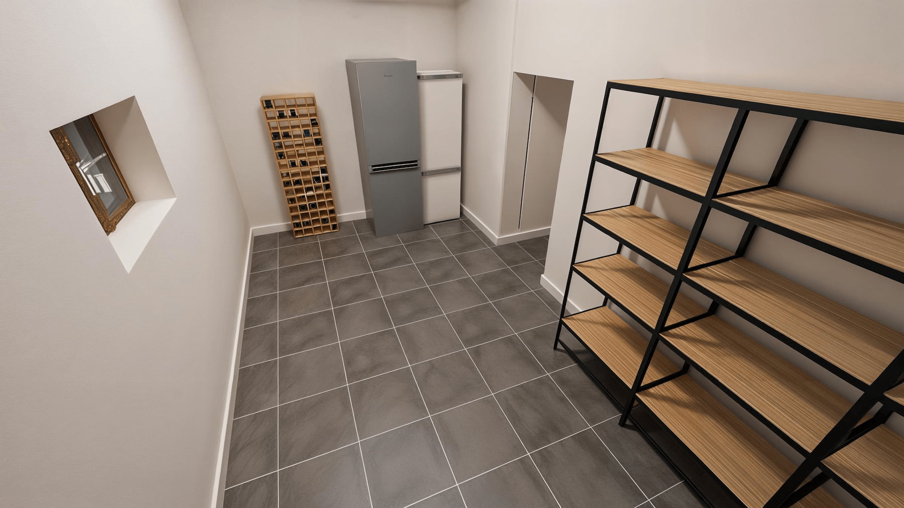 Cave : étagères métal/bois et zones de stockage clarifiées.