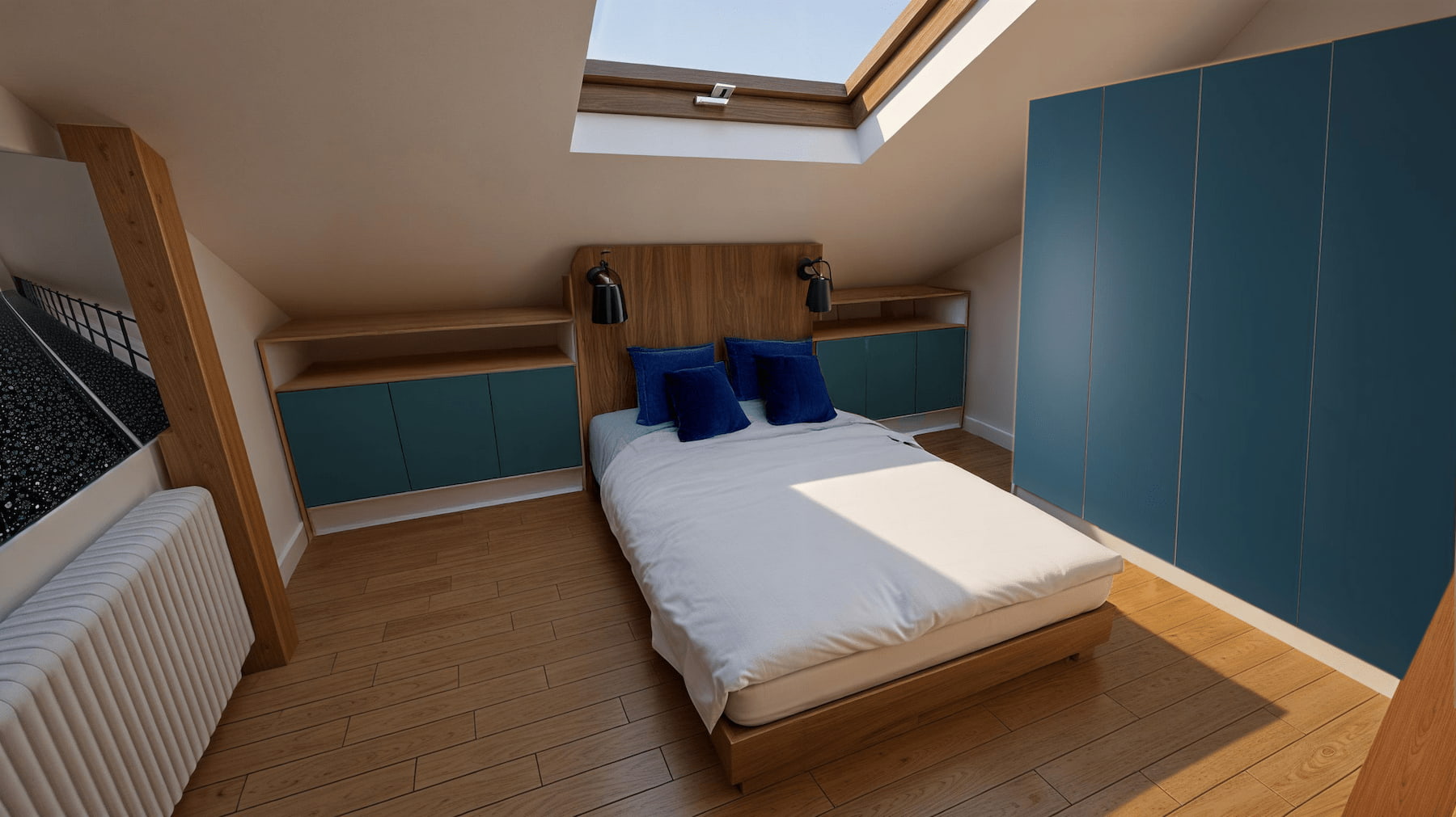 Chambre sous combles : tête de lit bois, rangements bas intégrés, teintes apaisantes bleutées.