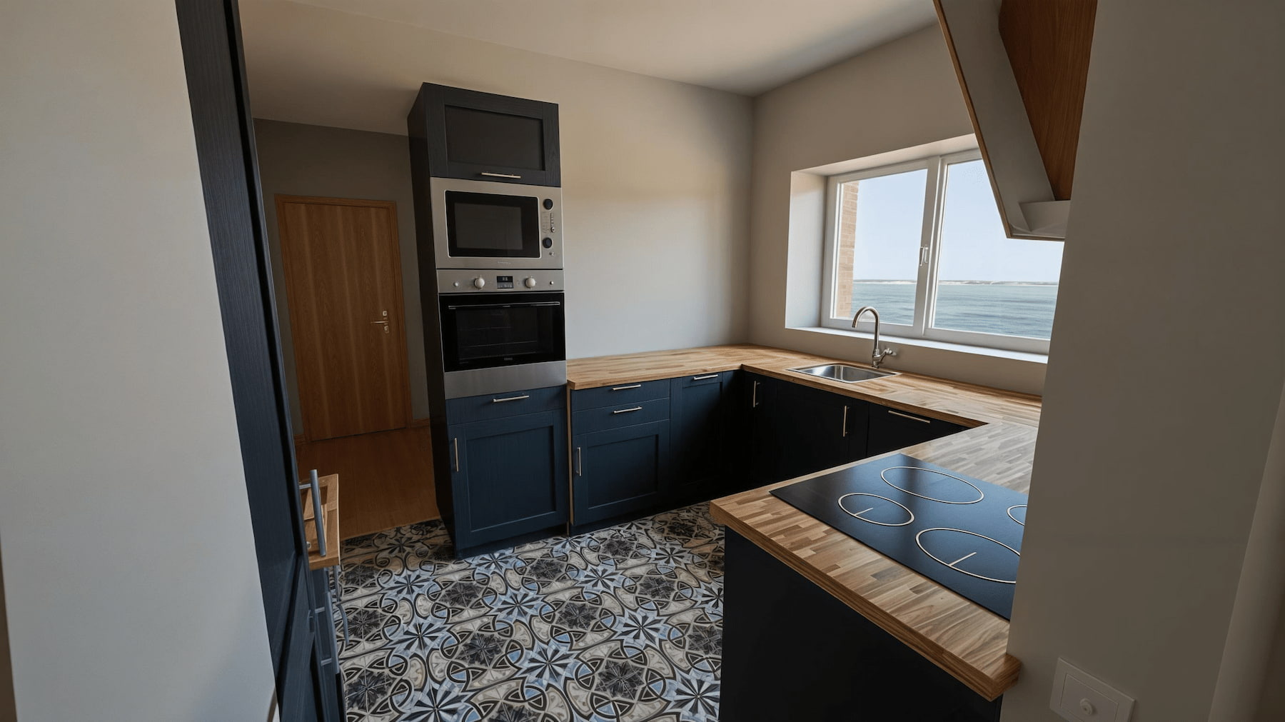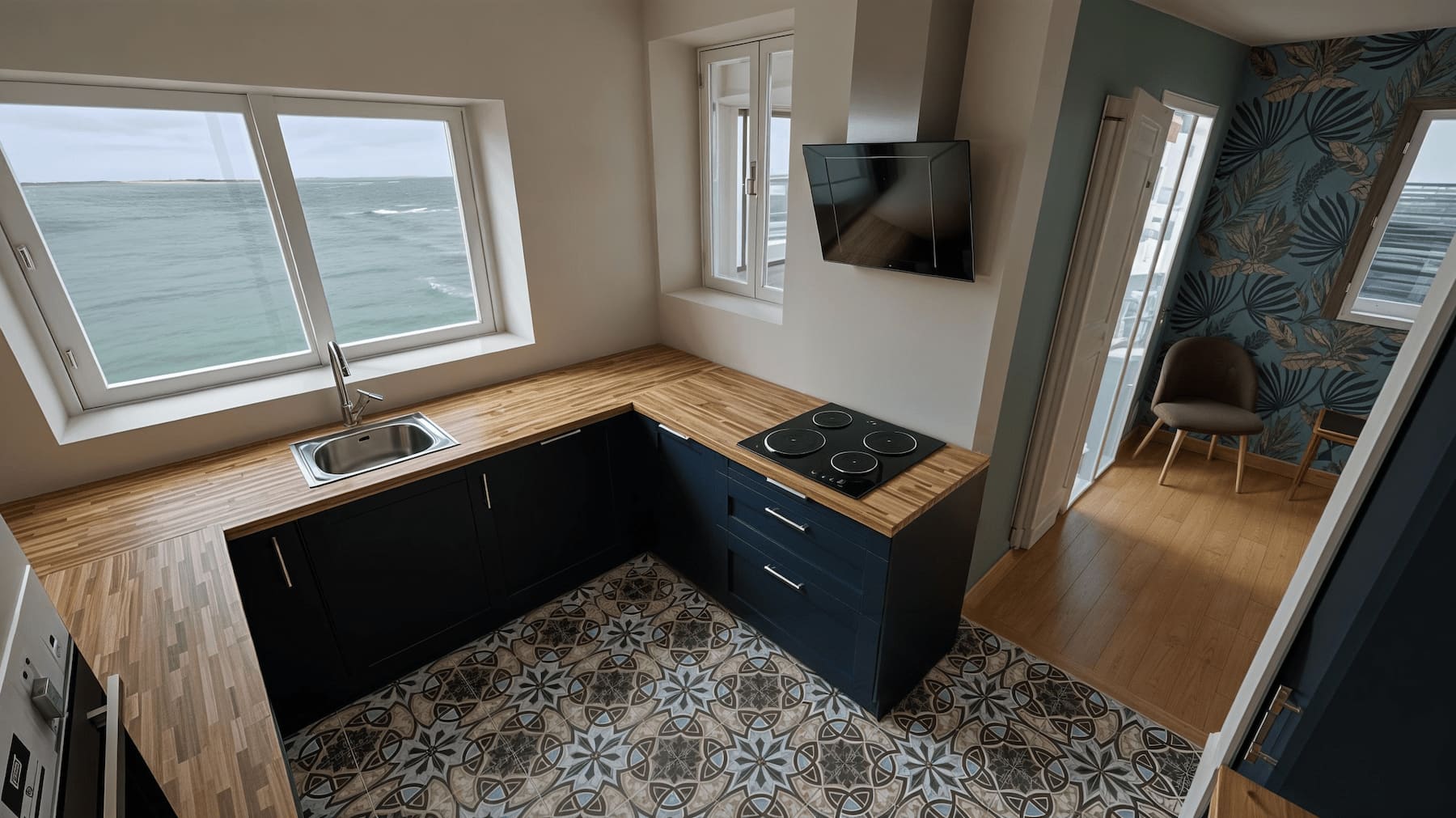 Mélange de textures : façades mates, plans bois chaleureux, carrelages graphiques.