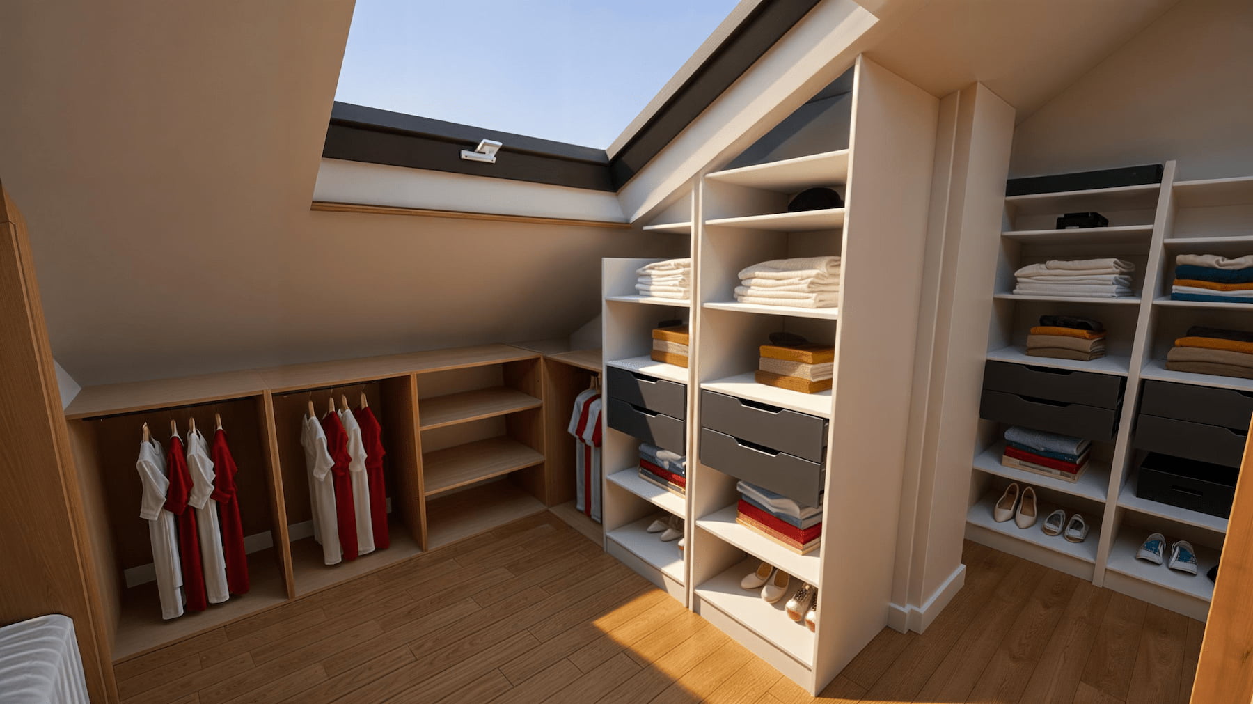 Dressing sur-mesure : modules ouverts, penderies double hauteur, tiroirs et étagères adaptés aux pentes, lumière zénithale par fenêtres de toit.