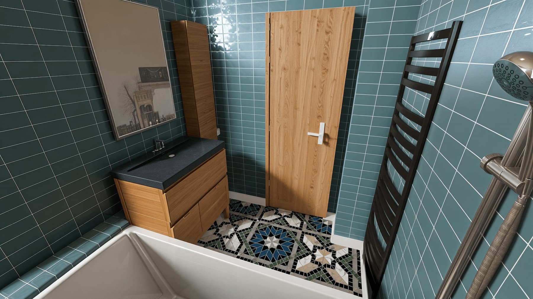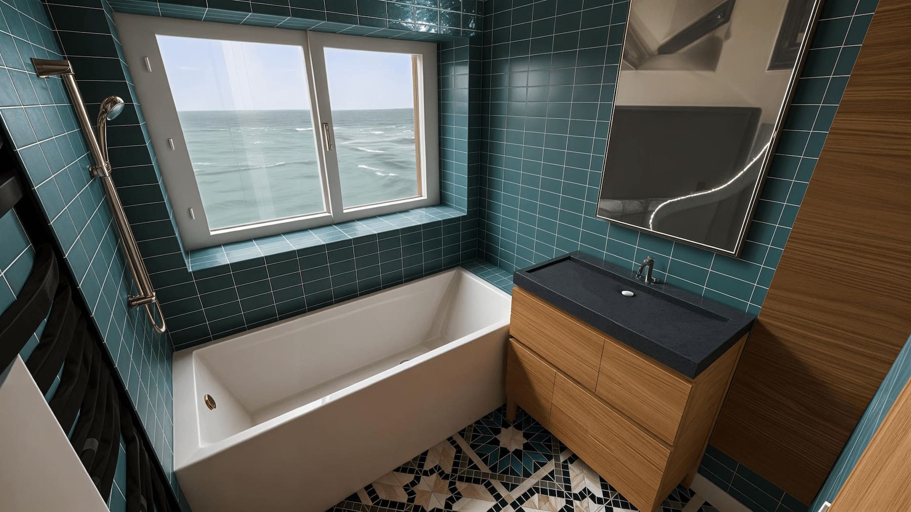 Carrelage vert profond, sol à motifs, meuble vasque bois sur mesure, baignoire confortable, sèche-serviettes noir.